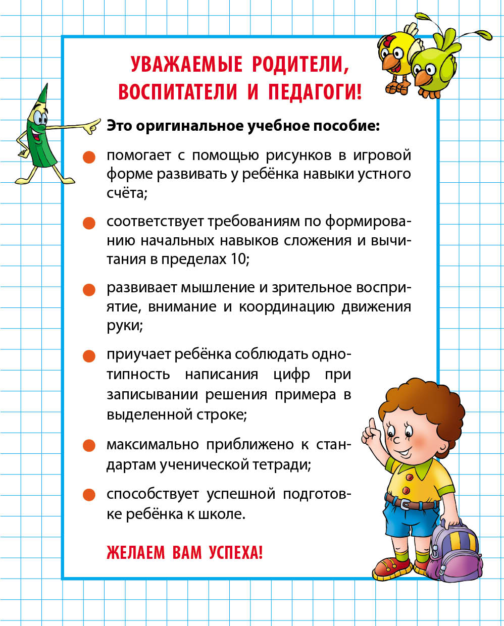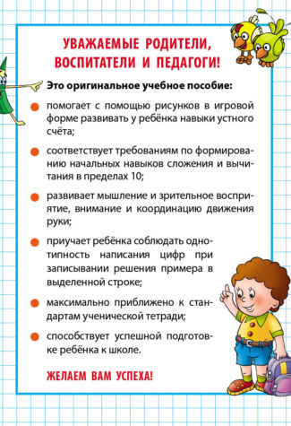 Главная / Развивающие пособия / Первые математические прописи / Складываем и вычитаем от 0 до 10. 4-5 лет Складываем и вычитаем от 0 до 10. 4-5 лет Развивающее издание для детей младшего и школьного возраста Артикул: ART098556 Категории: Первые математические прописи, Новинки и новые тиражи, Развивающие пособия Автор: Петренко С.В. Издательство: Мн: Книжный Дом Детали Детали Количество страниц 16 Обложка Обложка Год 2025 Формат 70х90/16 ISBN 978-985-17-2817-2 Возрастная категория 4+ Дата выхода 07.07.2025 Похожие товары Читаем по слогамРазвивающие пособияДетали Петя-петушок Подробнее Классические прописиНовинки и новые тиражиРазвивающие пособияДетали Каллиграфическое написание английских букв Петренко С.В. Подробнее